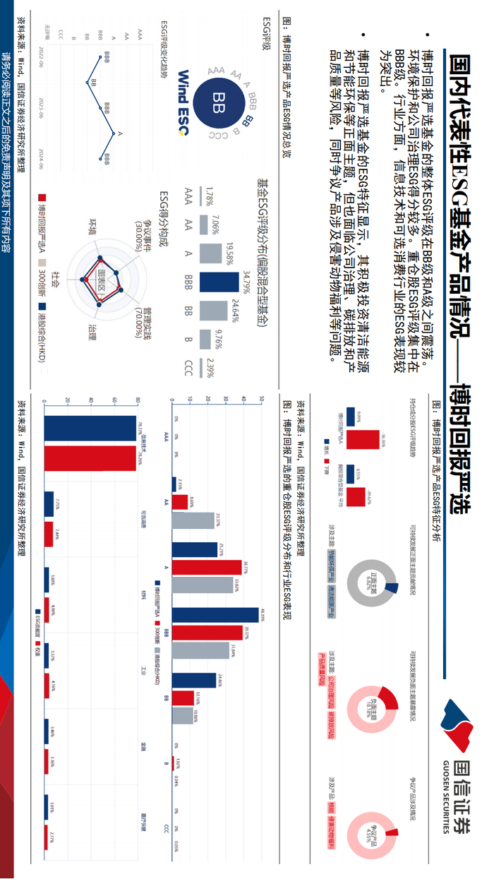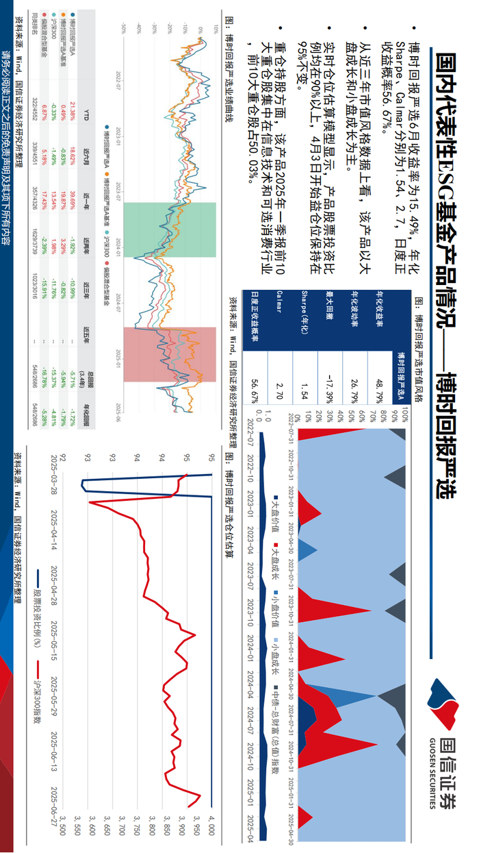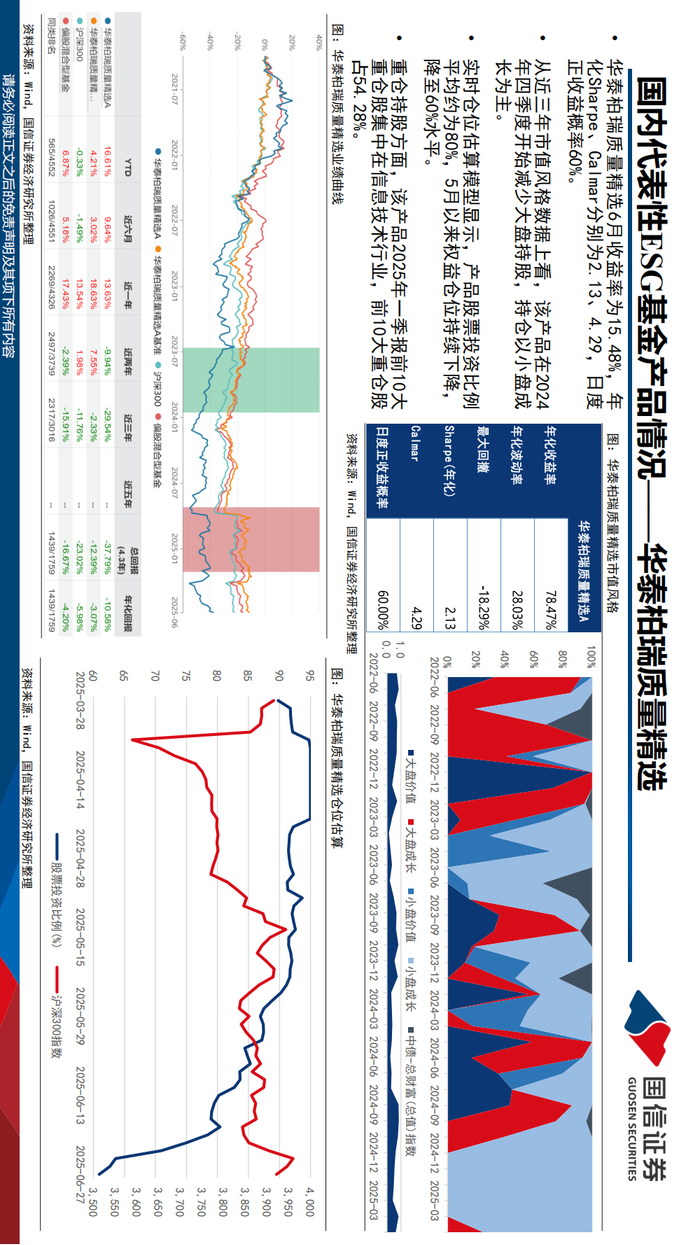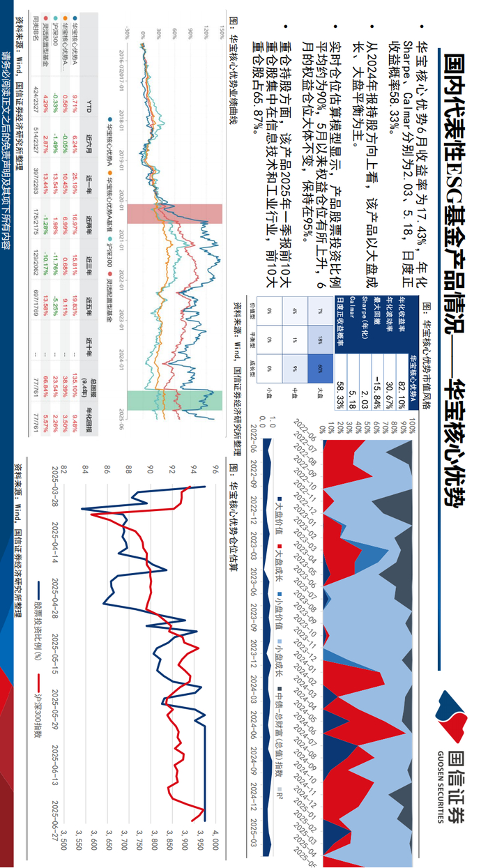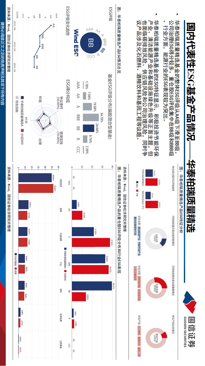 代表性产品情况:华宝核心优势:6月收益17.43%,权益仓位平均约为90%,重仓信息技术与工业(前十大持仓占比65.87%);ESG评级稳定BBB级。博时回报严选:6月收益15.39%,权益仓位稳定在95%,重仓信息技术和可选消费行业(前十大持仓占比50.03%);ESG评级波动在BB级和A级之间震荡。华泰柏瑞质量精选:6月收益15.48%,5月以来权益仓位持续下降,降至60%水平,持仓转向小盘成长,重仓信息技术行业(前十大持仓占比54.28%);ESG评级由AA降至BB级。