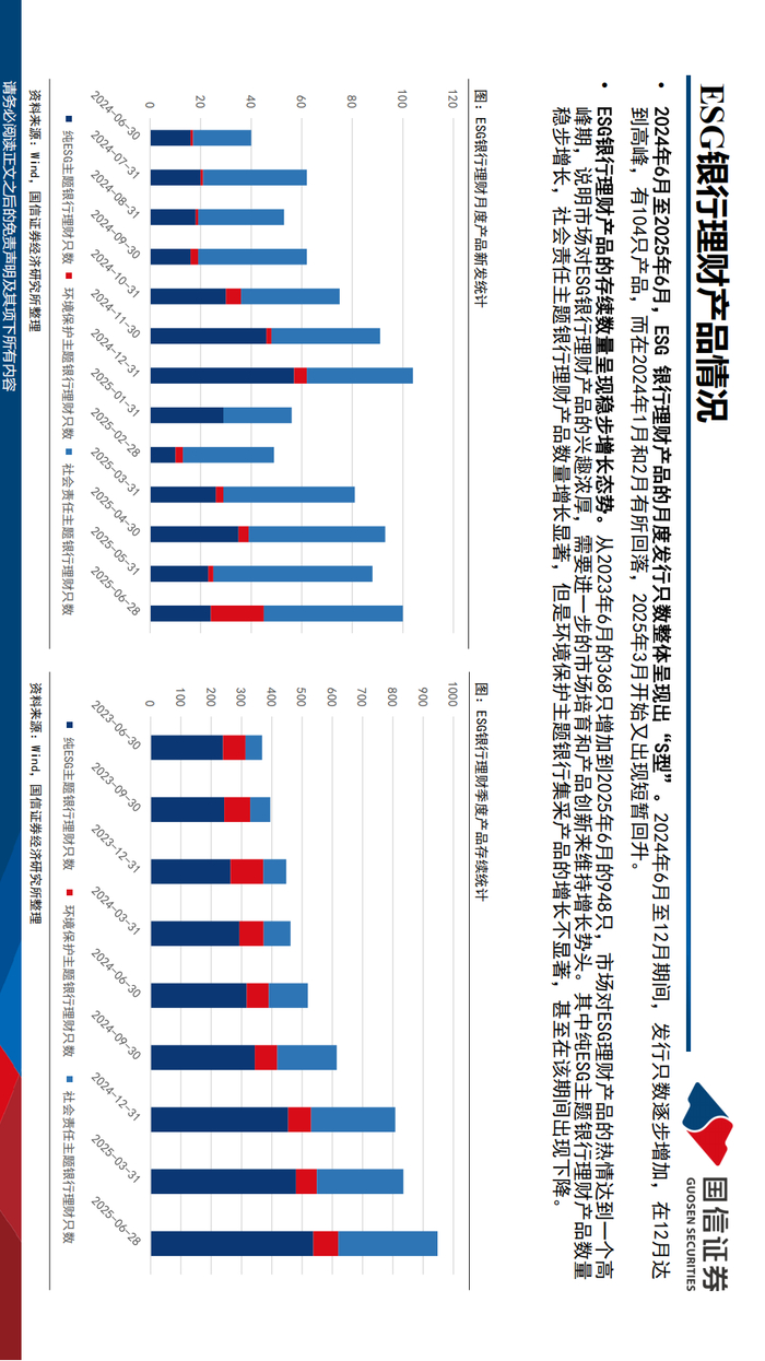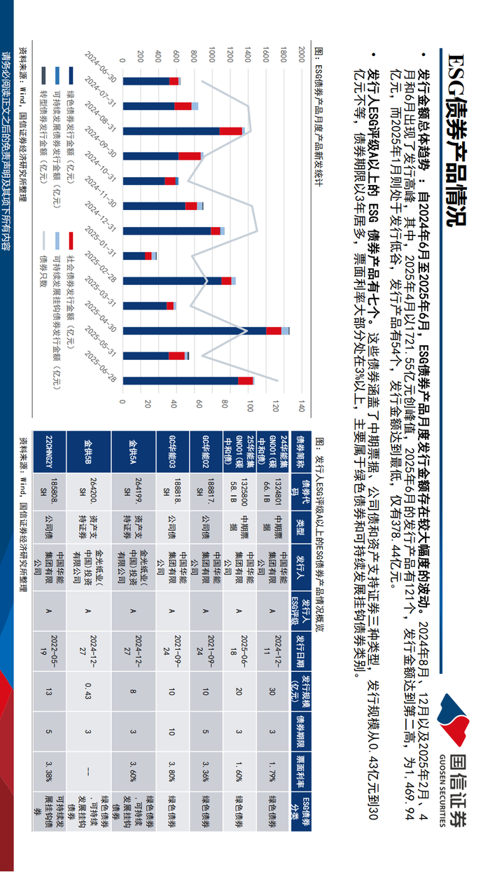 ESG产品概况:ESG公募基金产品情况:新发数量波动显著,2024年11月与2025年1月、3月达高峰,2025年2月及4月骤降;近两年整体规模增长但分化明显,ESG策略基金与环境保护主题基金增速领先,纯ESG主题、社会责任及公司治理主题发展平缓(公司治理产品数量稳定为20只)。ESG债券产品情况:ESG债券发行金额波动剧烈,2025年4月以1721.55亿元创峰值,6月发行金额达到第二高,为1469.94亿元,1月仅378.44亿元处于低谷;高评级(A级及以上)ESG债券共7只,主要涵盖绿色债与可持续发展挂钩债。ESG银行理财产品情况:发行量呈现出“S型”,2024年12月达104只高峰后回落,2025年3月开始出现回升;存续数量从2023年6月368只增至2025年6月948只,纯ESG主题稳步增长,社会责任主题显著提升,环境保护主题表现疲软。