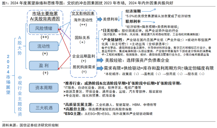 2024年,政策脉冲和盈利修复有望巩固A股向好,需求侧决定风险情绪和上涨空间。从内部视角来看,实体部门需求承压,对风险情绪回暖程度构成限制,历次股市趋势性上涨得益于实体供需共振,多是需求驱动供给,盈利回升斜率也和需求紧密挂钩;实体信心回暖到股市情绪好转存在时滞,股市预期方向乐观的基础上幅度仍可能表现为温和克制,供给端行情下更关注结构机会。从外部视角来看,2023年海外资金面因素对A股扰动最强,2024年海外流动性放宽先拔高估值,再传递到全球基本面回暖,短期利好中小成长,长期有望切向蓝筹价值,全年视角来看风格整体偏均衡。