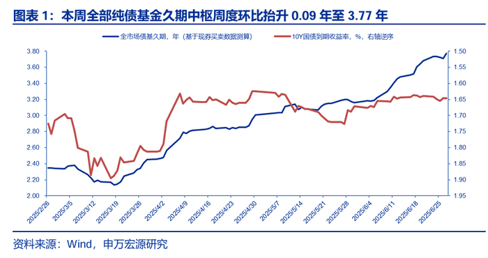 基于现券买卖数据测算结果,本周全部纯债基金久期中枢周度环比抬升0.09 年至3.77年。