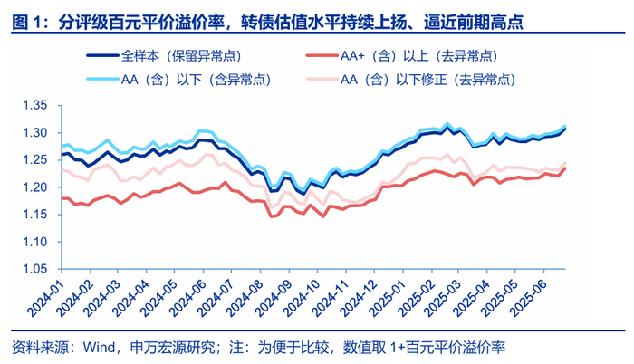 本周权益和转债市场突破关键点位、市场情绪整体较佳,转债估值继续拉升,百元溢价率上行至31%。全市场转债百元溢价率为31%,单周小幅上行1.06%,最新分位数水平处于2017年以来83.90%百分位。高、低评级转债估值分化不大,高评级转债估值表现略强。