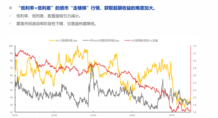 2025年的债市呈现出“走楼梯”行情节奏,本报告重点回答几个问题:1、今年债市为什么呈现“走楼梯”行情?2、资金利率与存单利率走势的差异在哪里?3、今年为何配置盘偏弱?4、利率下行的阻碍是什么?5、“走楼梯”行情下,如何应对?