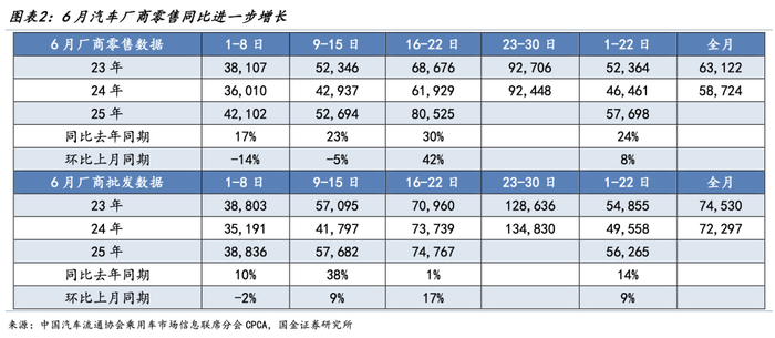 6月1-22日,全国乘用车市场零售126.9万辆,同比增长24%,环比增长8%。