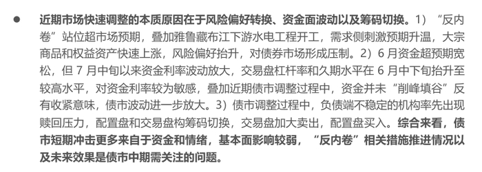 近期市场快速调整的本质原因在于风险偏好转换、资金面波动以及筹码切换。1)“反内卷”站位超市场预期,叠加雅鲁藏布江下游水电工程开工,需求侧刺激预期升温,大宗商品和权益资产快速上涨,风险偏好抬升,对债券市场形成压制。2)6月资金超预期宽松,但7月中旬以来资金利率波动放大,交易盘杠杆率和久期水平在6月中下旬抬升至较高水平,对资金利率较为敏感,叠加近期债市调整过程中,资金并未“削峰填谷”反有收紧意味,债市波动进一步放大。3)债市调整过程中,负债端不稳定的机构率先出现赎回压力,配置盘和交易盘构筹码切换,交易盘加大卖出,配置盘买入。综合来看,债市短期冲击更多来自于资金和情绪,基本面影响较弱,“反内卷”相关措施推进情况以及未来效果是债市中期需关注的问题。