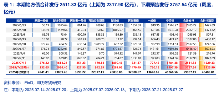 本期地方债发行与净融资发行环比均上升,预计下期地方债发行和净融资环比皆大幅上升。本期(2025.07.14-2025.07.20)地方债合计发行/净融资2511.83亿元/1529.33亿元(上期为2317.90亿元/1077.89亿元),下期(2025.07.21-2025.07.27)预计发行/净融资3757.54亿元/2923.90亿元。从加权发行期限来看,本期地方债加权发行期限为14.57 年,较上期(2025.07.07-2025.07.13)的14.17 年有所拉长。
