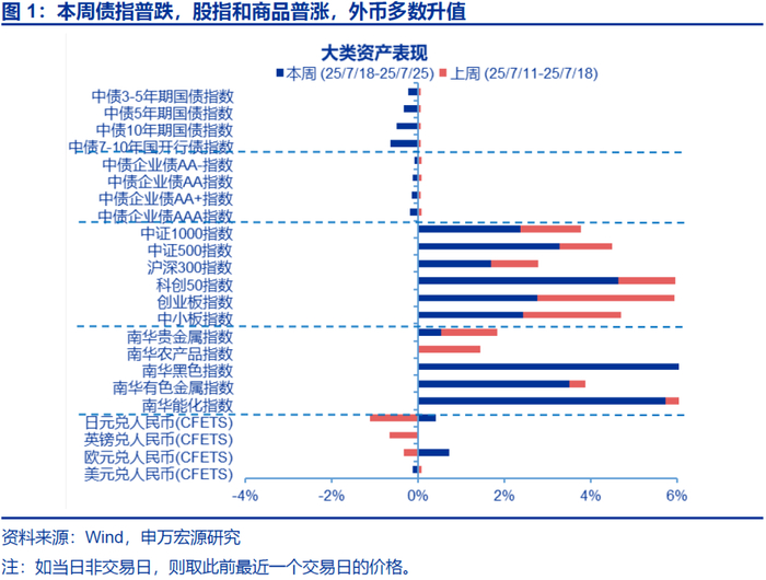 1.大类资产:本周债指普跌,股指和商品普涨,外币多数贬值
