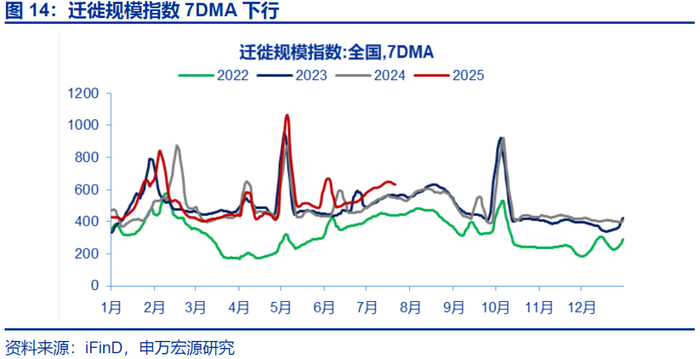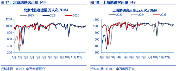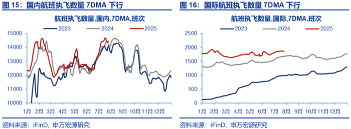人流物流:人员流动有所回落,货运价格小幅下行。人员流动上,本期全国迁徙规模指数7DMA周度环比下行1.79%。本期国内航班执飞数量7DMA和国际航班执飞数量7DMA周度环比均下行;本期上海、北京、深圳和广州地铁客运量均下行。货运流量上,公路物流运价指数4WMA周度环比下行0.03%,总量高于往年同期水平。