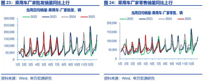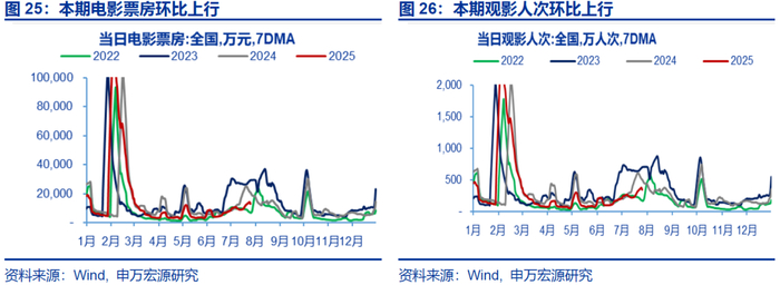 消费:汽车销量延续上行,物价多数上涨。汽车销量同比上行。上期乘用车市场批发与零售销量同比去年分别上8.00%和17.00%,批发同比增速4WMA上行,零售同比增速4WMA下行。本期电影票房周度环比上行10%,观影人次7DMA周度环比上行13%。农产品价格普涨,猪肉价格周度环比上行1.02%;蔬菜价格周度环比增长4.60%。