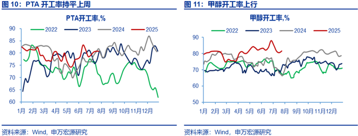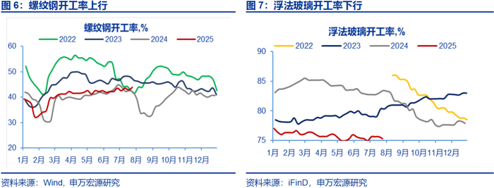 工业生产:生产总体平稳。从上游来看,本期全国电厂样本区域用煤量周度环比下行0.64%,石油沥青装置开工率周度环比下行4.00pct至28.8%,高炉开工率周度环比持平上周83.48%,粗钢产量周度环比上行2.10%。从地产链来看,螺纹钢开工率周度环比上行1.02pcts至43.95%,浮法玻璃开工率周度环比下行0.33pct至75.33%,磨机运转率周度环比上行2.50pcts至38.40%。从泛消费品链来看,涤纶长丝开工率周度环比下行0.85pcts至92.09%,PTA开工率周度环比持平上周80.76%,甲醇开工率周度环比上行1.06pcts至81.66%。从汽车链来看,汽车半钢胎开工率周度环比下行0.12pcts至75.87%,汽车全钢胎开工率周度环比下行0.08pcts至65.02%。