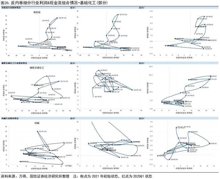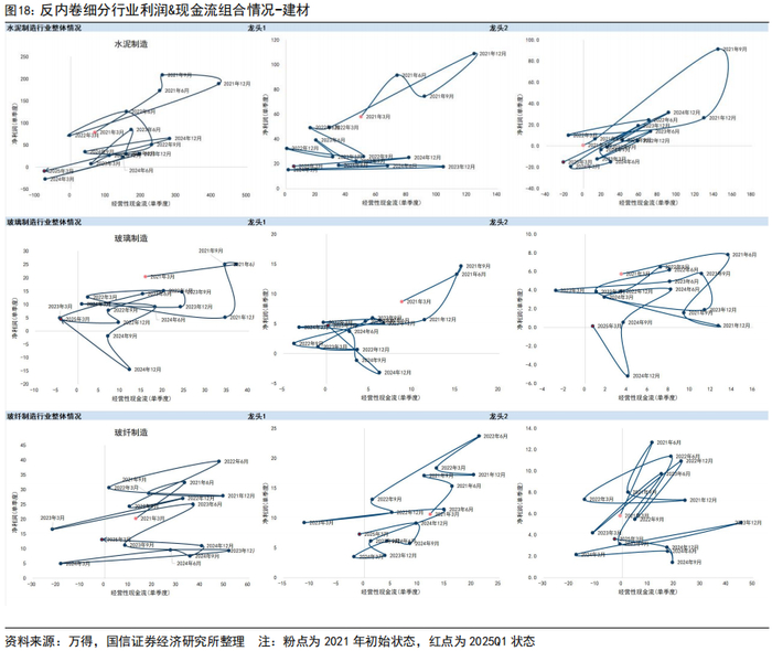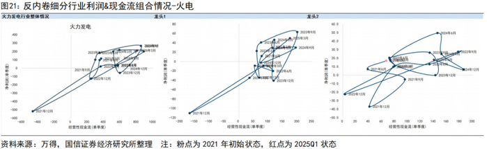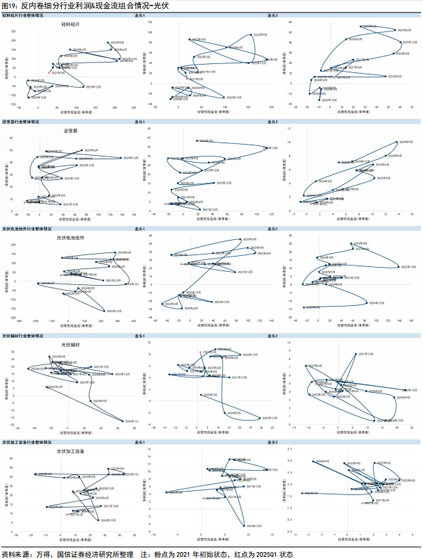 具体到当前反内卷核心行业,需在各行业内部精选细分方向。1)光伏包括硅料硅片、逆变器、电池组件、辅材、加工设备等行业,整体上看,除了逆变器、加工设备周期错位当前行业整体和龙头状态都是盈利外,硅料硅片、电池、组件等都处于“亏利润+亏现金流”的状态,电池组件龙头单季度利润亏幅收窄,在供给端限制底部价格的情况下关注需求端边际变化情况;2)建材领域水泥企业头部盈利,整体亏利润+亏现金流,玻璃整体亏损,玻纤头部企业盈利但现金流质量走弱,关注水泥行业内部亏利润但不亏现金流的企业;3)基础化工方面,有机硅4Q24、1Q25全部盈利主要由龙一贡献,其余公司分化,部分仅亏利润不亏现金流;磷肥及磷化工整体盈利和现金流表现来到2021年以来低位,但龙头有盈利且现金流质量强于2021年;纯碱整体产能利用率相对较高,头部企业利润和经营性现金流相对稳健,行业内部k型分化; 4)火电净利润周期性特征明显(Q4是季节性底部),平滑后行业整体利润、现金流压力都不大,仅有部分两广企业亏损,行业自律叠加渠道商价格约束下,格局有望进一步改善。