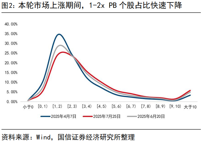 当前1-2x PB个股数量占比快速降至23%,消灭1-2x PB的过程持续进行。从全市场微观估值结构看,本轮一个重要的特征便是消灭“1-2x PB”个股,4月7日区间低点,PB在2倍以下的个股占比在45%左右,截至7月25日,PB在2倍以下的个股占比快速降至不足30%。7月16日以来,工信部十大重点行业稳增长、反内卷工作方案叠加雅下水电开工事件驱动,市场赚钱效应进一步提升。除了事件驱动相关板块的快速上涨外,自下而上看“1-2”倍PB的个股整体表现同样相对靠前,我们尝试复盘主升浪期间估值层面的微观结构变化,从中提炼相对可复制、可执行的经验规律。