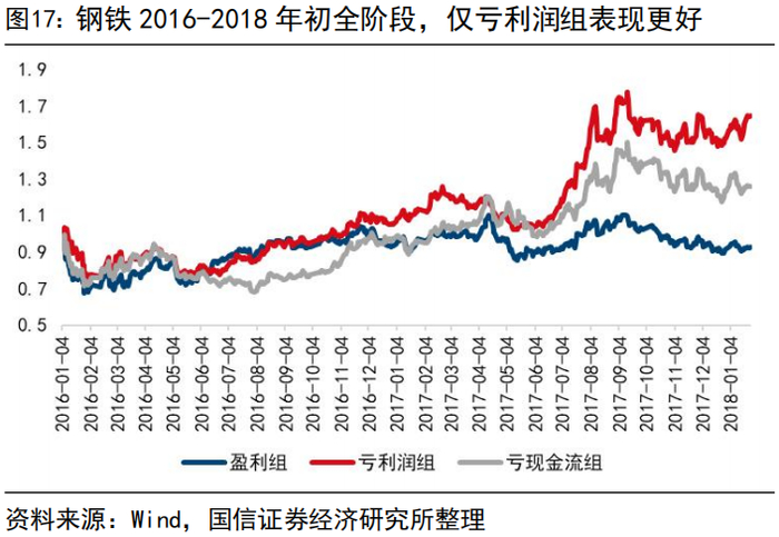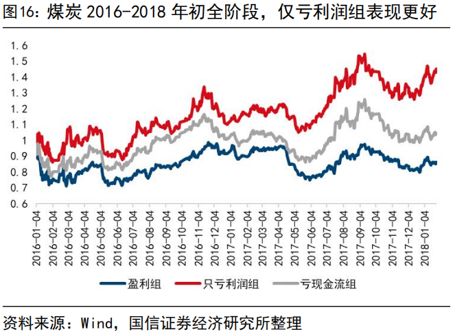 从长期超额收益情况看,“仅亏利润”强于“亏利润+亏现金”。我们基于2015年Q3、Q4的财报利润和经营性现金流量净额将煤炭、钢铁企业的截面运行状态划分为“盈利”、“仅亏利润”和“亏利润+亏现金”,上一轮供给侧结构性改革期间,对于原本自身盈利的企业而言,实质性刺激相对较小,全周期内波动率更低但无法跑出超额;钢铁和煤炭行业三组样本一致的节奏特征是,仅亏利润、不亏现金流的样本组合长期表现强于反内卷初始阶段既亏利润又亏现金流的公司。