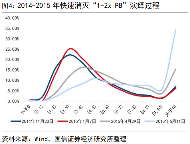 2014到2015年,1-2x PB个股的“全方位消灭”更依赖于杠杆资金的活跃。2014年两会后市场整体单边上行,但是实质上的全方位拔估值发生在2015年1月以后,整体上看,投资者快速加杠杆是“1-2x PB全方位消灭”的本质原因。2014年底以来融资买入额的斜率呈现三阶段变化,在相对平缓的阶段(2014.11-2015.1),期间“1-2x PB”个股占比仅从16%降至13.5%附近,2015年3月至6月,两融余额从1.2万亿上升至2.2万亿以上的过程中,日均融资买入额同样快速上涨至2000亿+,PB在1-2倍的个股数量占比从13.5%快速下降至4%,并于6月降至2%。
