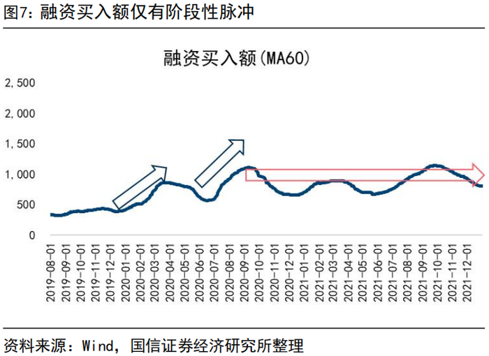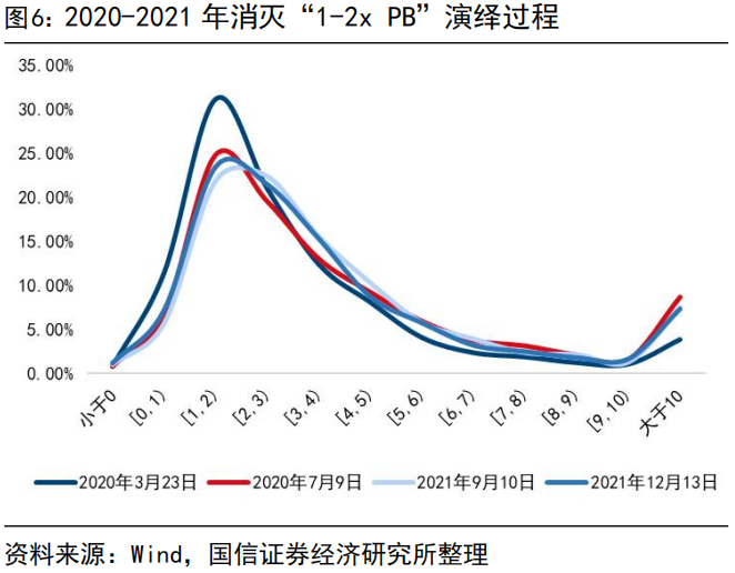 2020-2021年期间,1-2x PB个股占比阶段性减少,估值分布稳态达成与杠杆资金稳态运行基本同频。仅仅从估值分布的角度看,2020年7月的阶段性高点与2021年9月、2021年12月的两个高点估值分布基本一致,2020-2021两年震荡向上的过程中,仅仅是脉冲式消灭1-2xPB个股,在2021年9月、2021年12月1-2倍PB个股数量占比基本与2020年7月的第一个阶段高点相近。