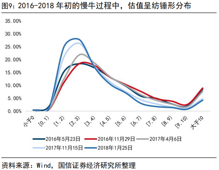 一轮相对顺畅“指数慢牛行情”中,不一定出现系统性消灭1-2x PB的过程。2016年至2018年初的慢牛行情,风格上完全偏向大盘,在“供给侧结构性改革+棚改货币化”驱动下,ROE向上,大盘价值、大盘成长拔估值、小盘、微盘受制于前期外延式并表扩张带来的即期增速持续性存疑而“杀估值”,大小盘在基本面修复和估值变化路径上的背离最终呈现到全A层面的结果是高PB小微盘和低PB超大盘的均值回归,比例上1-2x PB个股数量甚至有所提升。另一个“指数越涨、低PB个股越多”现象背后的原因在于,2017年的市场行情非常割裂,向上的指数背后是失真的个股赚钱效应,大盘全年跑赢全部个股收益率均值近20pct。传统行业产能集中、龙头崛起的过程中,市场赚钱效应是“聚焦”而非“扩散”,因此并未出现所谓的系统性消灭低估值个股的过程。