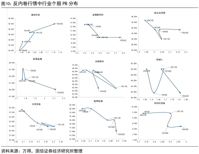 从过往的案例梳理和内在运行规律看,“系统性消灭1-2x PB”的必要不充分条件包括:1)赚钱效应不断扩散,即轮动可以加快,但不能出现阶段性“泥沙俱下”的调整行情;2)增量资金脉冲,较为典型的增量资金包括两融和散户;3)各类风格的基本面预期同向,盈利向上过程中大盘相对小盘在ROE边际变化斜率上无明显优势,或是“分子端盈利弱、纯估值驱动”的行情中,更容易出现没有低估个股的泡沫化终局,即“银行>1x PB,其他大于2x PB”。“反内卷”行情爆发也是消灭各自板块内1倍以下&1-2倍PB个股的过程,向后看,中上游行业内卷式拔估值或率先进入稳态模式,作为跨行业高层次政策主题,后续分化轮动上涨过程中核心主线拔估值的时间更长、空间更大。