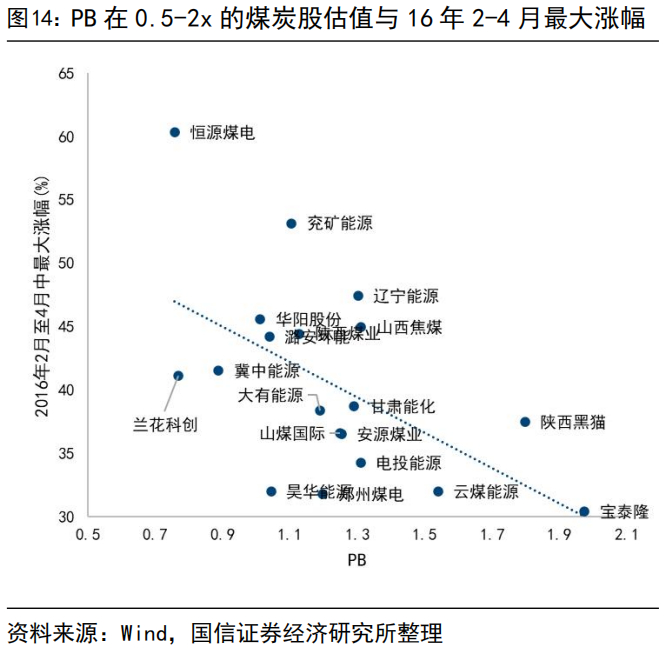 政策重点提及行业(如煤炭、钢铁)第一轮上涨过程中相对全A的最大超额大约在20个百分点附近。钢铁、煤炭等行业相对全A跑出短期超额的进程极快,2015年末至2016年1月中上旬,煤炭、钢铁相对全A分别跑赢16.18%、17.06%,而后开始出现超额收益收敛,阶段性最大跑输超过20pct。这一段更多属于抢跑政策过程中的定价,政策未正式推出前往往出现1-2轮这样的抢跑,可以是下跌过程中提前止跌,亦或是反弹过程中的展现弹性。2月1日纲领性政策出台后,2月至4月中旬更多是主题驱动阶段,期间股价领先于煤价,区间涨幅高于指数涨幅的个股并没有基本面优势,部分小市值样本依赖流动性驱动。