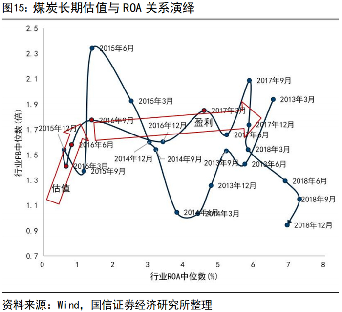 重资产行业“反内卷”下的两阶段超额演绎路径为:“ROA→,PB↑”到“ROA↑,PB→”。不同于综合评价股东回报和企业估值水平校准的PB-ROE框架,对重资产行业营运效率的分析可以观测ROA的变化路径,拉长时间看,行业在供给侧结构性改革政策推出2个季度后迎来基本面修复,报表端确认相较于煤价反弹大约滞后一个季度左右,2016年Q3往后,行业自身PB中枢维持相对稳定,ROA中枢快速提升,第二波超额由盈利驱动。