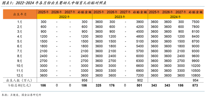 一是2025年1月1日之前出生、不满3周岁的婴幼儿,对应2022-2024年2812万人的出生人口。《方案》明确“对2025年1月1日之前出生、不满3周岁的婴幼儿,按应补贴月数折算计发补贴”,对应的补贴规模共计854亿元。