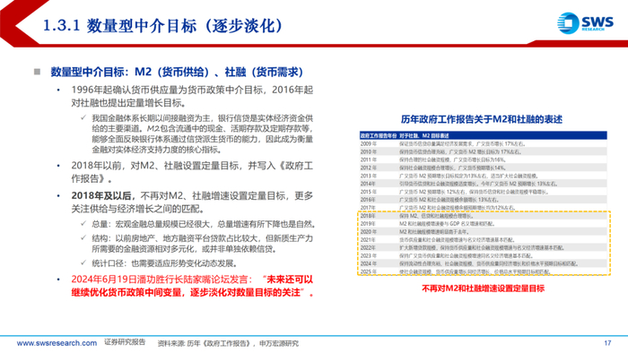 2)中介目标:设置中介目标能够解决货币政策传导过程中的信息不对称、时滞性和调控精准性问题,通过设立可观测、可控制的中间变量,搭建从政策工具到最终目标的桥梁。目前我国货币政策的中介目标还是M2与社融,但2024年6月19日潘功胜行长陆家嘴论坛发言提及“未来还可以继续优化货币政策中间变量,逐步淡化对数量目标的关注”,与货币政策调控框架进一步向价格型转型相呼应,人民银行或开始向价格型中介目标进行探索。