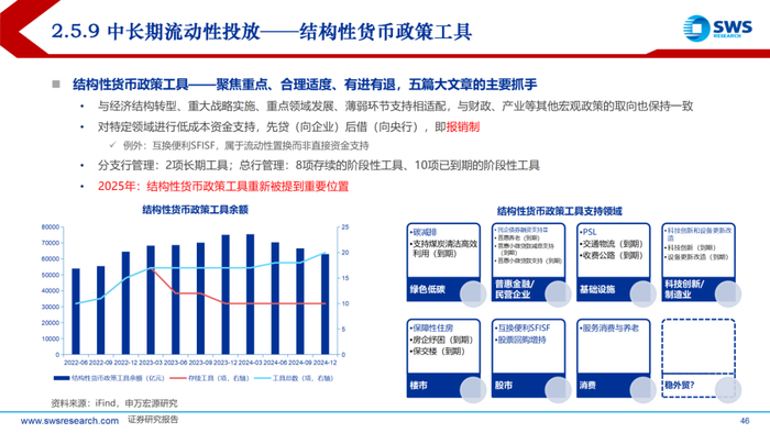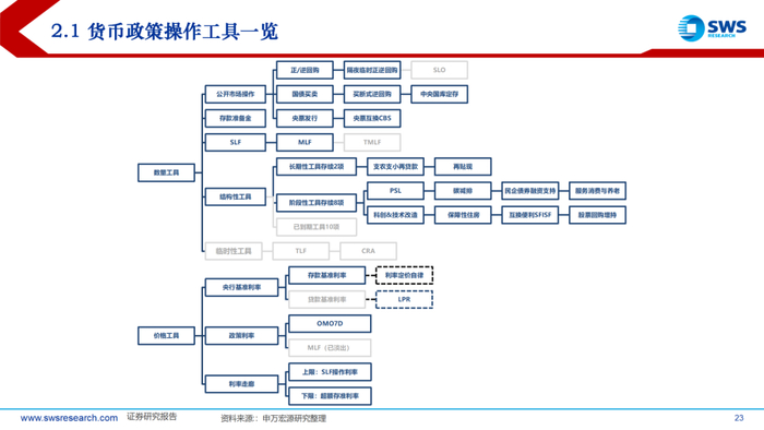 1)数量型工具方面,重点影响基础货币,主要包括公开市场操作(如逆回购、买断式逆回购、国债买卖、发行央票等)、存款准备金、中央银行贷款(如SLF、MLF、结构性货币政策工具等)等,含各项结构性货币政策工具在内,历史上共有30余项数量型货币政策工具。