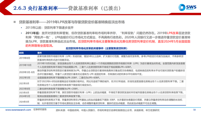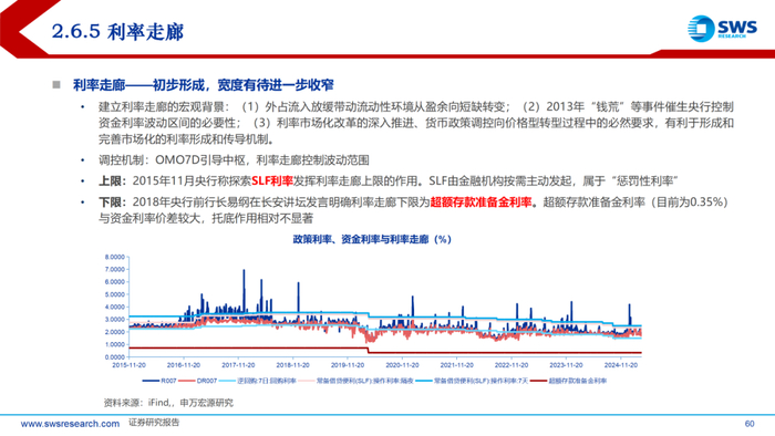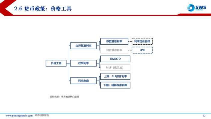 2)价格型工具方面,重点影响价格水平,主要包括存款基准利率(利率市场化改革后从他律走向自律,更多通过利率定价自律管理发挥效果)、贷款基准利率(LPR改革与置换之后已被替代)、政策利率(OMO7D,此前曾有过中期政策利率MLF,现已淡化并退出)、利率走廊(上限为SLF,下限为超额存款准备金利率)。
