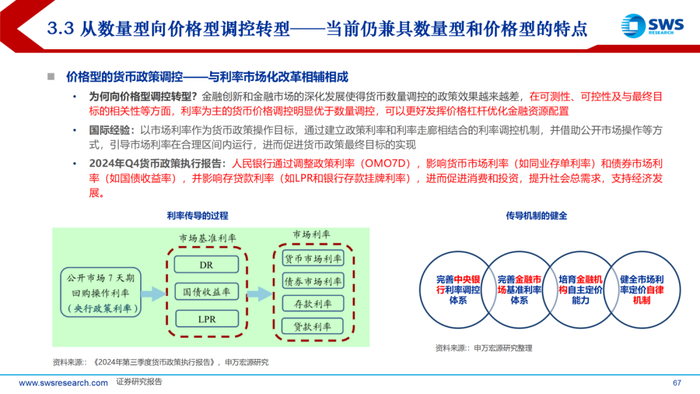 3)中央银行正加速推进货币政策调控向价格型转型:金融创新和金融市场的深化发展使得货币数量调控的政策效果逐渐弱化,在可测性、可控性及与最终目标的相关性等方面,利率为主的货币价格调控明显优于数量调控,可以更好发挥价格杠杆优化金融资源配置。价格型传导的雏形:人民银行通过调整政策利率(OMO7D),影响货币市场利率(如同业存单利率)和债券市场利率(如国债收益率),并影响存贷款利率(如LPR和银行存款挂牌利率),进而促进消费和投资,提升社会总需求,支持经济发展。