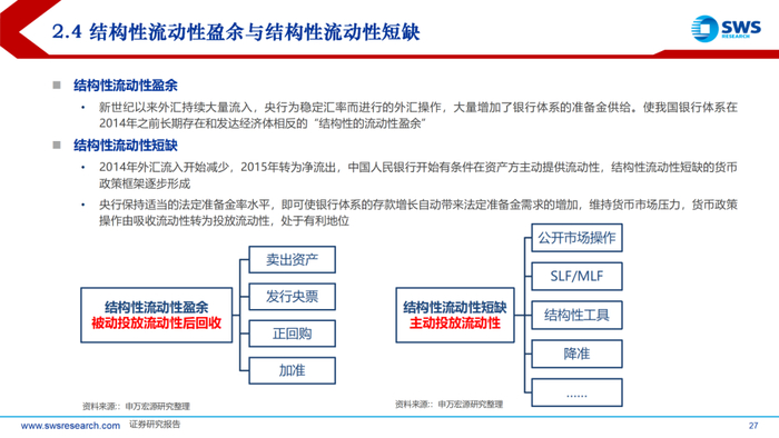 2012年下半年:我国外汇占款占比见顶回落,央行基础货币投放方式逐渐从被动投放向主动投放过渡。为满足主动投放基础货币的需求,央行推出了一系列创新货币政策工具,包括SLO、SLF、MLF等。该类工具成为央行调节市场流动性的重要手段,央票等回笼流动性的工具作用逐渐减弱,逐渐退出历史舞台。——结构性流动性短缺的货币政策操作框架