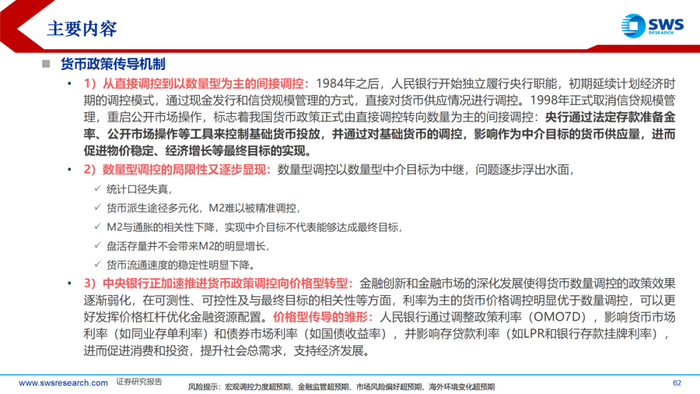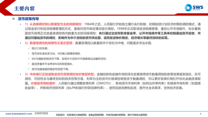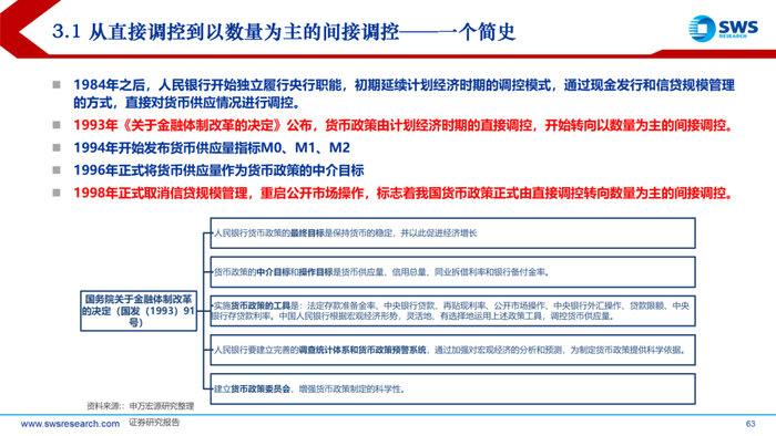 1)从直接调控到以数量型为主的间接调控:1984年之后,人民银行开始独立履行央行职能,初期延续计划经济时期的调控模式,通过现金发行和信贷规模管理的方式,直接对货币供应情况进行调控。1998年正式取消信贷规模管理,重启公开市场操作,标志着我国货币政策正式由直接调控转向数量为主的间接调控:央行通过法定存款准备金率、公开市场操作等工具来控制基础货币投放,并通过对基础货币的调控,影响作为中介目标的货币供应量,进而促进物价稳定、经济增长等最终目标的实现。