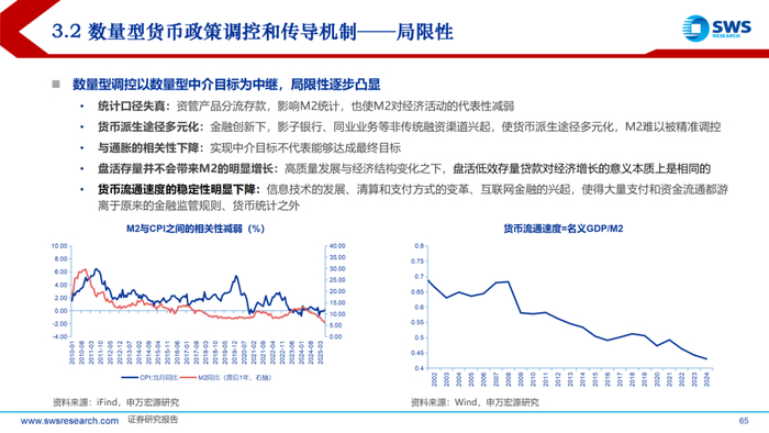 2)数量型调控的局限性又逐步显现:数量型调控以数量型中介目标为中继,问题逐步浮出水面:统计口径失真;货币派生途径多元化,M2难以被精准调控;M2与通胀的相关性下降,实现中介目标不代表能够达成最终目标;盘活存量并不会带来M2的明显增长;货币流通速度的稳定性明显下降。