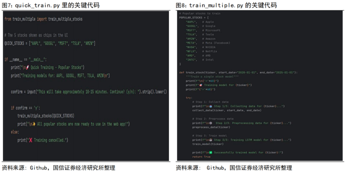 这是数据训练的起点,quicktrain和trainmultiple的主要区别在于前者已经预设好了五只热门股票的训练数据,而后者可以通过用户自定义股票来进行训练: