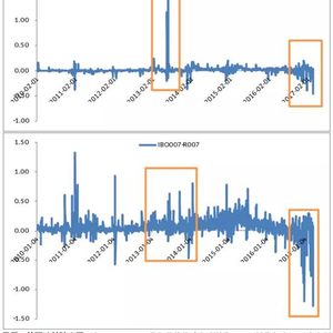 最后,从理论基础来看,参照LIBOR-OIS指标作为资金紧张的指示器,该指标在2008年经济危机时期达到峰值,当时市场的流动性近乎枯竭,需求远大于供给使得该指标形成脉冲。而该指标作为流动性的指示器的原因在于:LIBOR作为伦敦同业银行间拆借资金的利率,而OIS作为联邦基金利率的代表利率,由于LIBOR相对于OIS而言存在拆借对手方的信用风险,因此一般LIBOR会大于OIS;而这种基准利率之间的差异一般不太明显,只有当流动性遭遇极大冲击的时候LIBOR和OIS之差才会迅速升高,因为这个时候拆借对手方的信用风险会充分暴露,即使对手方作为LIBOR指标的组成部分,同时也是因为在这个时候拆出行也不存在多余资金或者也缺乏资金,才使其拆出成本突然高企。而本文指标选取正是基于此:由于同业拆借利率类似LIBOR存在拆借对手方信用风险,而质押式回购利率存在质押物,所以信用风险相对较低;在流动性正常的时候,两个指标都可以作为基准利率,所以一般不存在较大差异。而当遭遇流动性的极大冲击时,一方面由于存在拆借对手方的信用风险,另一方面同业拆借利率的参与者基本是银行类机构,当其本身也不存在多余流动性或者同样缺乏流动性的时候,拆借利率就会迅速升高,由于以上两个原因,导致IBO001-R001和IBO007-R007在市场整体极度缺乏流动性的时候会迅速走高,形成脉冲式效应,特别是隔夜指标。但是,目前的状况又有所不同,央行相对并未收缩资金供给,而是通过价格抬升来体现稳健中性的货币政策,从而体现出银行与非银类机构资金的结构性紧张,即同业拆借利率相对质押式回购利率走低,造成IBO001-R001和IBO007-R007的下行趋势。