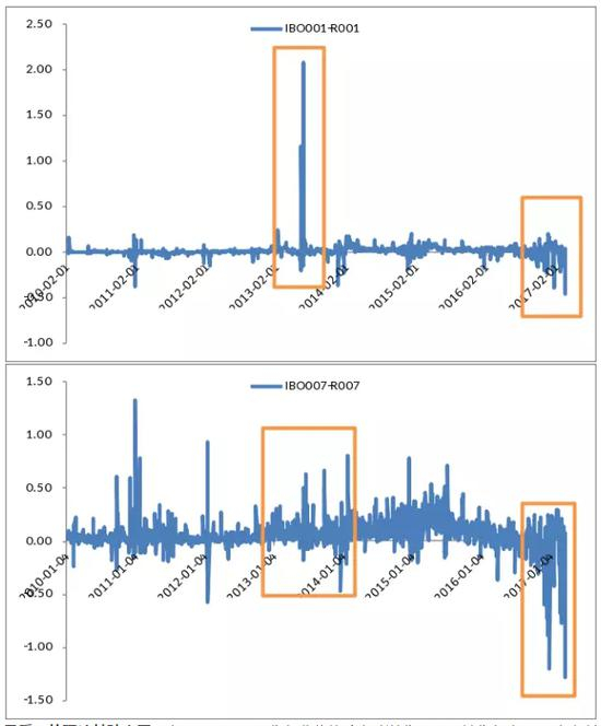 再者,从技术指标来看,本文选取银行间同业拆借利率和银行间质押式回购利率之差(具体理论基础在下面进行阐述)分析彼时与今日的资金面状况,同时选取1天和7天两个期限,即IBO001-R001和IBO007-R007。从下图中看出,2013年和现在的指标分别呈现不同的状况:2013年IBO001-R001和IBO007-R007呈现大于零的趋势,而现在IBO001-R001和IBO007-R007呈现出小于零的趋势。