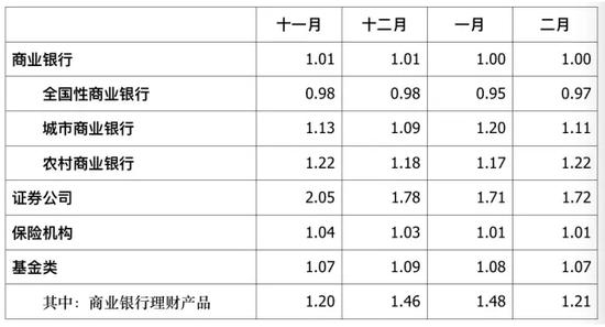 央行稳健中性的货币政策带来资金面结构性紧张的局面:去年年末债券市场由于各方面的因素利率上行,叠加国海事件等因素影响使得非银类机构难以从银行机构获得流动性支持,造成非银机构的流动性极度匮乏。而随着去杠杆进程的深化,负债端波动增大使得前期资产负债息差杠杆套利模式不可持续,而资本市场逐步认识到负债端管理的重要性,有些机构甚至专门通过资金借出来获利的现象也使资本市场各机构的去杠杆进程逐步加快;而对于不同的杠杆主体,依据其体制及入场时机等因素的不同,其去杠杆速度也有所区别,近期光大转债冻结大量资金等因素引起的资金面紧张局面就颇有深意;从下表中可以看出,基金等非银机构由于去杠杆政策执行较为到位,相对充裕的流动性使其可通过高价借出资金获利,而银行类机构流动性相对紧缺(即使考虑到银行类机构面临季末MPA考核问题资金相对紧张,但是股份行和城商农商行大量高位发行同业存单接续资金链以防资产端浮亏实现,侧面表明其去杠杆进程较慢),因此,非银机构相对银行机构去杠杆速度较快,可能是导致结构性紧张主体切换现象的原因之一。而对于流动性均源于央行的银行和非银机构来说,当下结构性紧张局面互相切换的现象颇有“本是同根生,相煎何太急”的凄凉感。