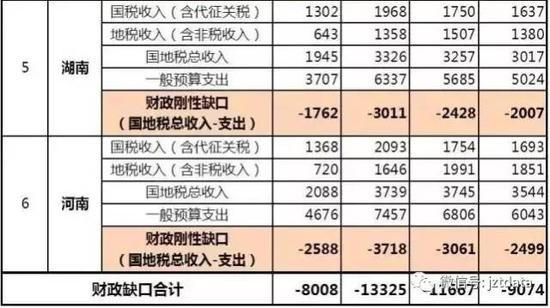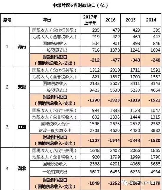 中部片区6省,海南、安徽、江西、湖北、湖南与河南(说明一下,海南实在是没片区合适放,所以放到了中部),基本上都是人口大省,当然也是财政缺口大省。