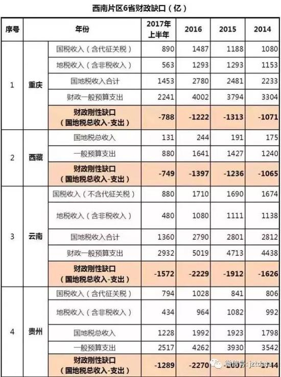 2016年,重庆的财政缺口1222亿,西藏1397亿,云南2229亿,贵州2270亿,广西2412亿,四川3542亿,合计13072亿。与2014年的合计财政缺口规模10020亿相比,增幅30%。今年上半年的财政缺口合计7040亿,预计今年的总缺口将超过1.5万亿。