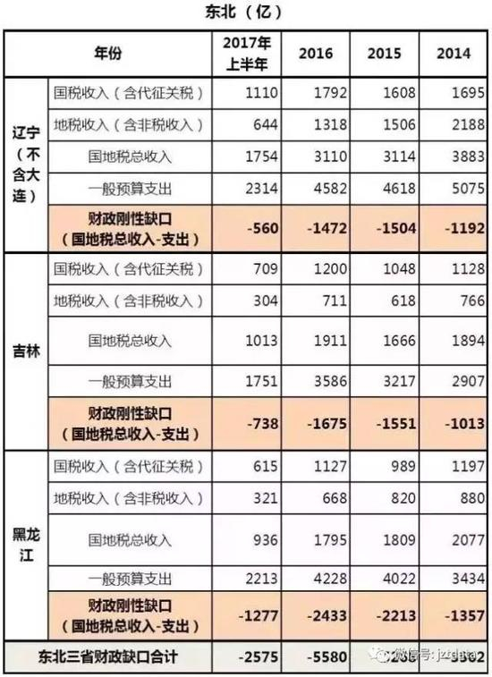 东北三省的财政缺口越来越大,2014年合计为3562亿元,2015年激增至5268亿元,2016年继续增长到5580亿元,2017年上半年为2575亿元,考虑到下半年财政压力更大,预计2017年要直奔6000亿元了。