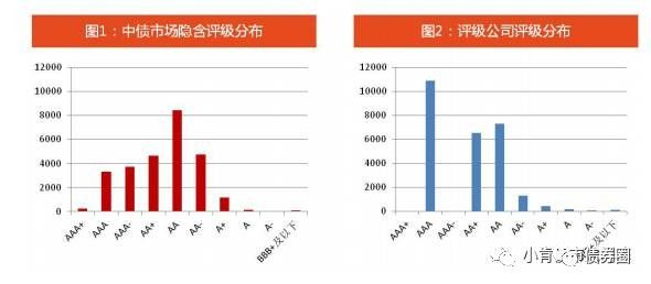 第二个层次难度远比第一个层次大,则是关注在外评、真实资质、债券流动性影响下的信用主体的价格水平和与比较标准的偏离度。其实就是定价,每一只债交易在什么价格才合理,出现多少落差的时候就可能有机会。熟知这一点就难了。有一个比较好的学习方法是每天关注QB(无法在家看)或者Wind BBQ(可以在家看,但少一家国利)的二级成交记录以及Wind中的当日一级发行情况。还有就是关注中债隐含评级。该评级是包含了市场成交价格和发行主体披露信息后的,其分布和外评存在较大区别,上一张图: