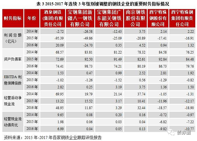 因此,我们认为,导致钢铁企业级别发生变动的主要财务因素有:利润总额、资产负债率、EBITDA利息保障倍数、经营活动净现金流、经营现金流动债务比。表3我们列出了2015-2017年连续3年级别被调整(仅调整展望的不考虑)的钢铁企业的重要财务指标情况,我们可以看出,这些钢铁企业的主要财务指标变动情况基本与我们的结论保持一致。