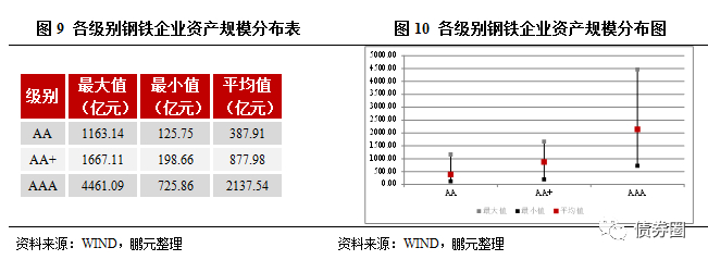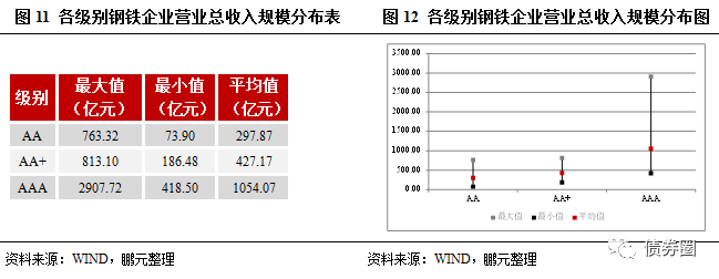 (1)从评级角度来说,由于规模是信用评级中最重要的标准,我们将钢铁企业的资产规模、营业总收入规模与其级别进行了映射,据此我们可以大概判断一家钢铁企业的信用级别;