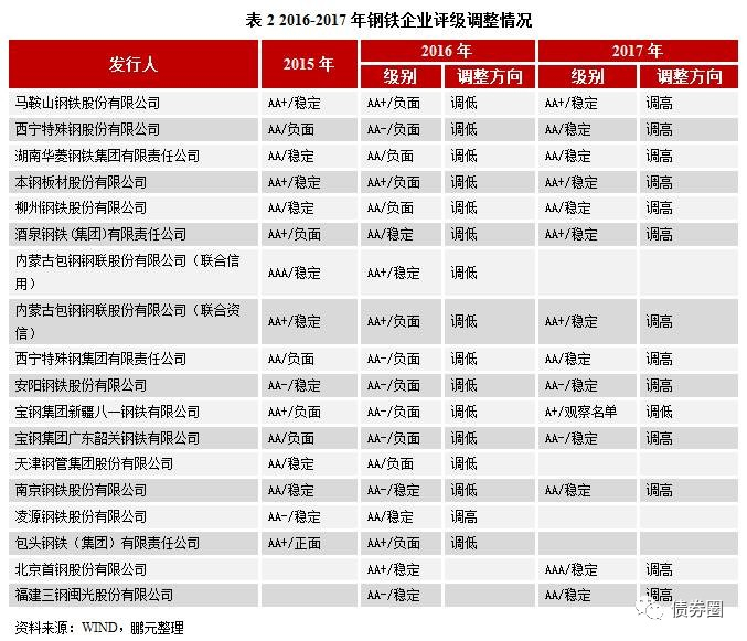2015-2016年,由于钢铁行业盈利情况发生较大转变,所以行业内企业评级调整较多,多数企业在2016年跟踪评级时被调低级别,2017年跟踪评级时又被调高级别,具体情况如表2所示。