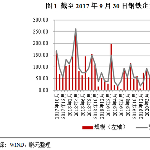 截至2017年9月30日,信用债市场共有181只钢铁行业存量债券(包含企业债、公司债、短期融资券、中期票据、定向工具、可交换债)[1],规模为3,312.95亿元,由42家钢铁企业发行,见附表。其中,首钢集团有限公司债券余额为790亿元,远超其他企业,位列第一;其次是河钢集团有限公司,债券余额为578亿元;山东钢铁集团有限公司以321.8亿元的债券余额位居第三;接下来分别是江苏沙钢集团有限公司、鞍山钢铁集团有限公司、宝山钢铁股份有限公司,债券余额也都超100亿元。