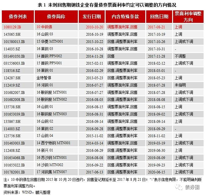 181只存量债券中,有75只债券设计有特殊条款。其中,仅设计回售条款的有2只;设计回售和调整票面利率条款的有33只;设计赎回、延期和调整票面利率条款(此类永续债一般调整票面利率的方向均是上调)的有8只;设计交叉违约条款的有32只。鉴于近期发生的“14万华MTN001”回售期后未回售债券票面利率被下调至1%事件,这里我们把所有未到回售期的、但是设计回售和调整票面利率条款的债券列出,并指出其募集说明书约定的票面利率可以调整的方向,以供参考。可以看出,企业债和交易所公司债一般约定的可以调整票面利率的方向是上调,而银行间债券市场的中期票据和定向工具一般约定的可以调整票面利率的方向是上调或者下调。
