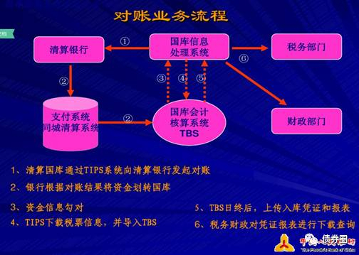 三、银行划缴税款的实操过程了解具体规定后,再看一下银行实操流程:纳税人缴税扣款后,银行将扣款的信息反馈TIPS系统,银行向国库划缴税款需“先对账、后划款”:清算国库与清算银行在系统日间运行状态下进行日间对账和日切对账,日间对账为每日一次到数次,即商业银行系统收到TIPS系统对账报文后,反馈回执,根据对账结果,通过大额支付系统,使用A102报文向国库划缴资金。
