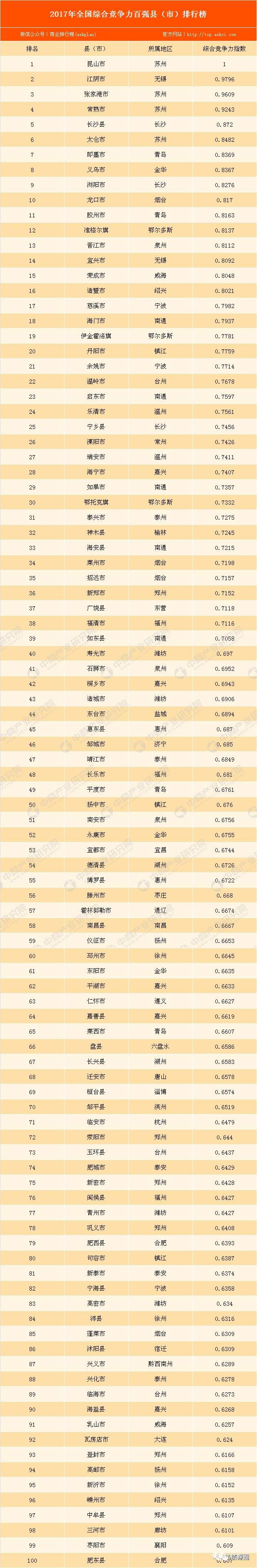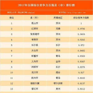 2017年全国综合竞争力百强县(市)前十排名分别是:昆山市、江阴市、张家港市、常熟市、长沙县、太仓市、即墨市、义乌市、浏阳市和龙口市。其中,江苏省占据五席,湖南和山东各占两席,浙江占1席。广东县市无缘前十。