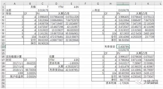 该题里面注明了“资本利得可粗略用久期*收益率变动计算”,这一块可能有一定误导性,笔者一时大意,也疏忽了2倍杠杆的情况,实际上该题没有正确答案,对此也与不少读者进行了沟通、交流。有网友指出“第一题的结果应该是10.1吧。一年后久期为4,所以(6%+4*0.2%)*2-3.5%。用真实数据测算,这只券应该剩余期限6年117天,久期4.9996,票息5.5%每年付息,当前付出全价101.13,对应净价97.39。117天后收到5.5的票息。一年后收到全价102.36,对应净价98.62。以两个全价和一个票息,用excel测算XIRR6.9%。两倍杠杆减去杠杆成本6.9%*2-3.5%=10.3%。”并发来了测算的表格。