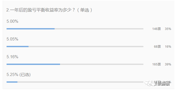 针对盈亏平衡收益率的计算,需要将持有债券的收益折合成相对应的资本利得损失所对应的收益率上行幅度,即可估算出盈亏平衡收益率。以上述假设为例,在收益率不变的情况下,债券持有一年的收益率=4.8%-3%=1.8%,动态的看待问题,1年后债券的久期变为4,因此1.8%的持有收益率可抵补收益率上行幅度=1.8%/4=45bp,因此,盈亏平衡收益率=4.8%+0.45%=5.25%。