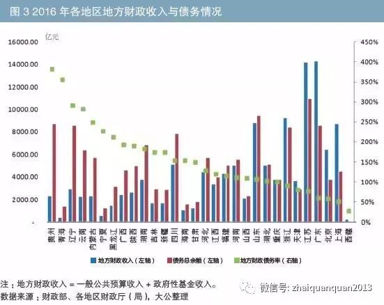 2016年,受国内经济下行影响,部分企业经营陷入困境,信用风险增加。部分地区主导产业的不景气直接影响地区经济发展,区域经济增长差距明显。产能过剩行业、产业结构单一的辽宁、山西等地受工业发展水平下滑影响明显,工业增加值减速幅度大,公共财政收入增长缓慢。从债务规模来看,截至2013年6月末,以江苏为首的东部地区债务规模远高于中部地区和西部地区,但随着部分东部地区产业向中西部转移,基建投资在中西部等省份中主导地位更加突出,固定资产投资的过快增长导致债务规模逐年增长。截至2016年末,地方财政债务率较高的地区主要集中在中西部及东北地区部分省份,如贵州、云南、四川及辽宁等地区(见图3)。