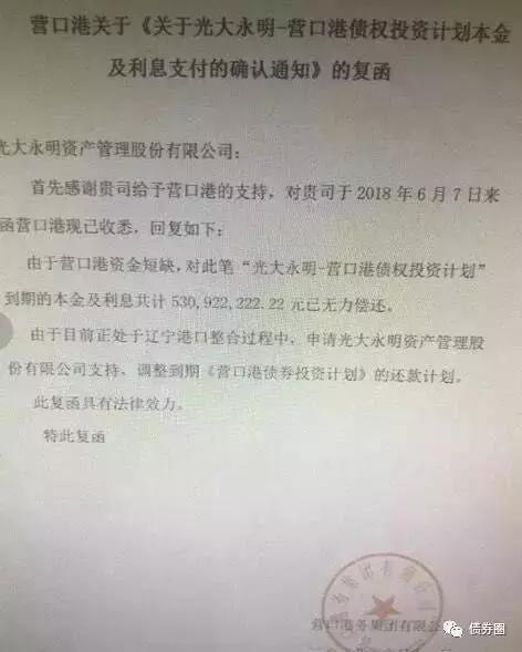 复函称,由于目前正处于辽宁港口整合过程中,申请光大永明资产管理股份有限公司调整《营口港债权投资计划》的还款计划。复函落款日期为6月11日。