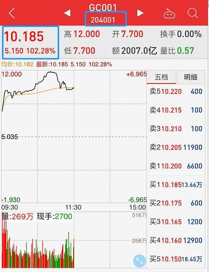 对了,上交所跟深交所的门槛是不一样的。上交所是10万块钱起步价,深交所良心一下,1000块钱起步。加入你账户钱不够玩不了204001,那就试试深交所的131810。